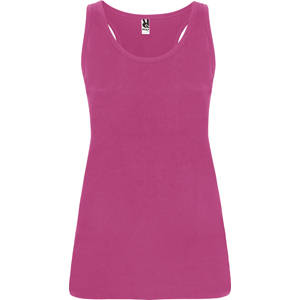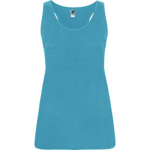 Camiseta entallada, con sisas y escote ribeteado, ancho y enrollado. Espalda estilo nadadora y costuras laterales.