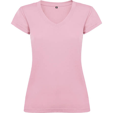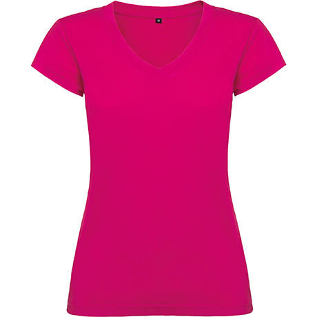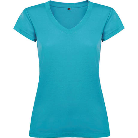 Camiseta de mujer con manga corta, escote en cuello de pico y acabados en ribete acanalado. Corte entallado con costuras laterales.