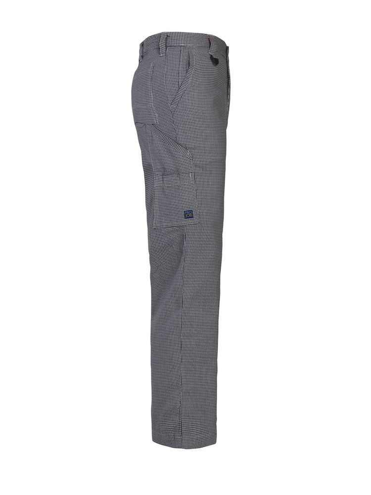 Pantalón de chef sin pinzas. Dos bolsillos laterales. Bolsillo con cierre de cremallera en el lado derecho. Dos bolsillos traseros. Dos ”cargo pockets”; el derecho para cuchillo y pinzas, el izquierdo lleva tapeta y tiene espacio para el móvil.