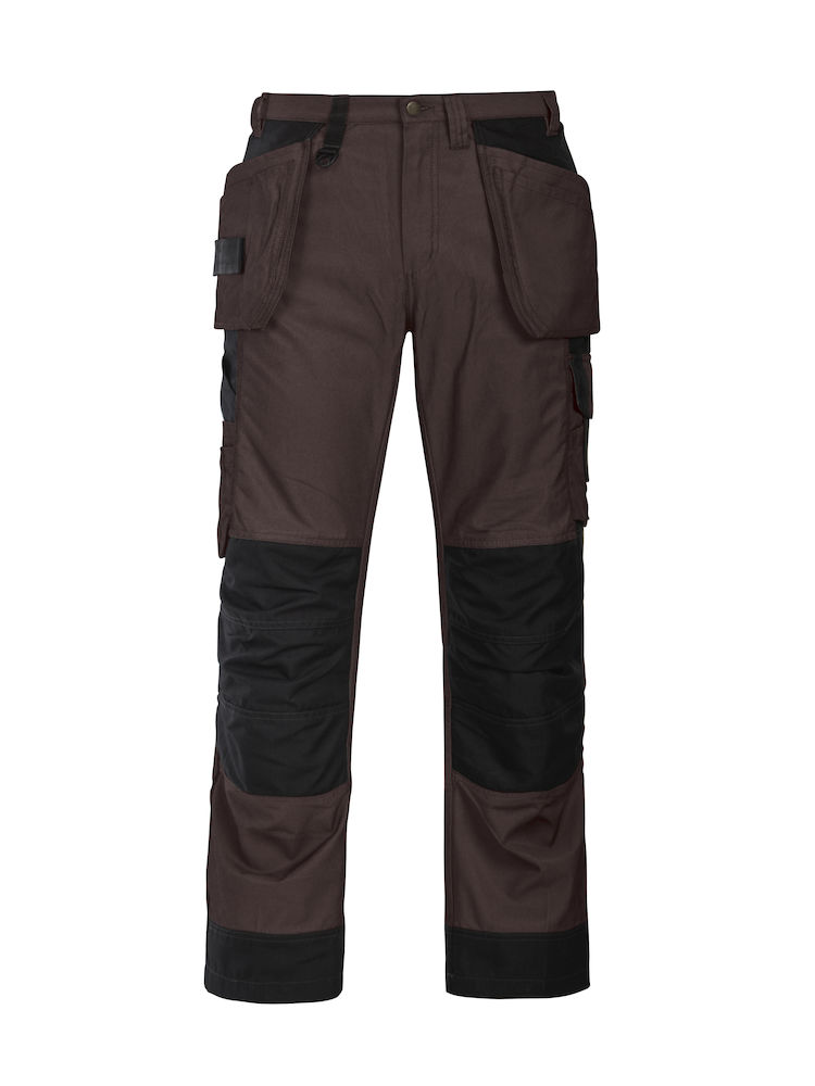 Dos bolsillos colgantes para pequeñas piezas metálicas (clavos) que se pueden ocultar en los laterales, uno de ellos con bolsillos pequeños y el otro con trabillas para colgar herramientas, reforzados con 100% Cordura®. Bolsillos tipo ”cargo pockets” con espacio para móvil, bolígrafo, metro y herramientas. Dos trabillas ajustables para colgar el martillo. En la cintura lleva dos anillas para colgar llaves. Bolsillos protectores ajustables de Cordura® para las rodillas con abertura interior. La parte baja detrás de las piernas está reforzada con Cordura®. Los bolsillos traseros y los ”cargo pockets” están adaptados para acoplar nuestros Inbags.